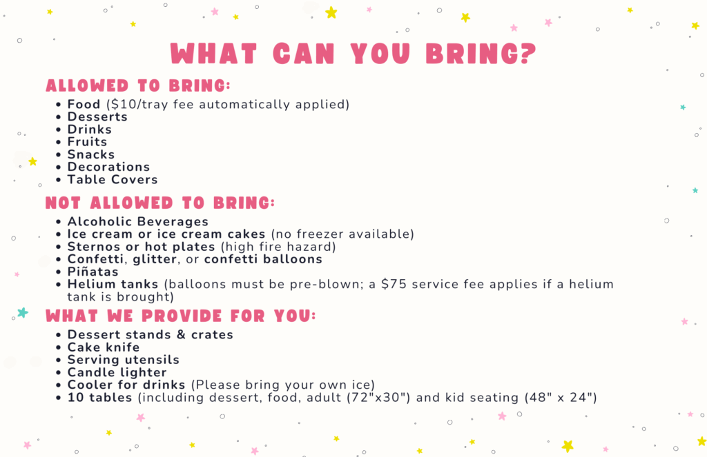 Please have your orders (w/ any add ons & substitutions) finalized and ready a week prior to your party date.