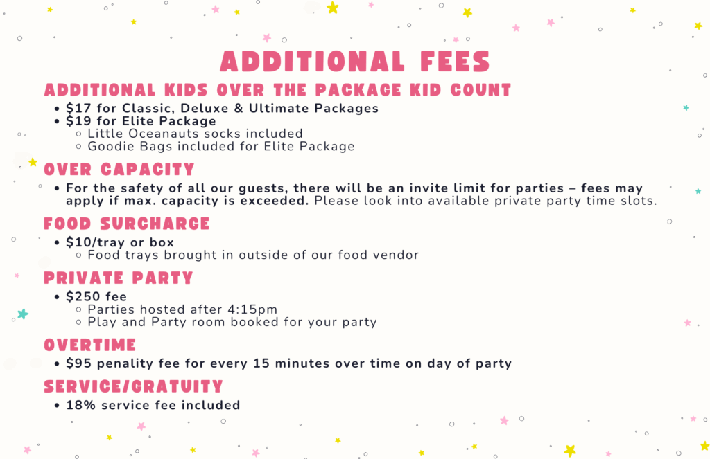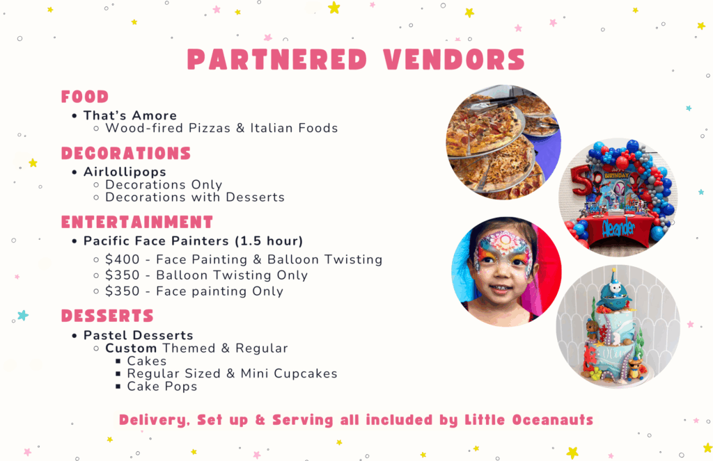 All Food Vendor orders must be made through Little Oceanauts to ensure there is no miscommunication and food surcharges.