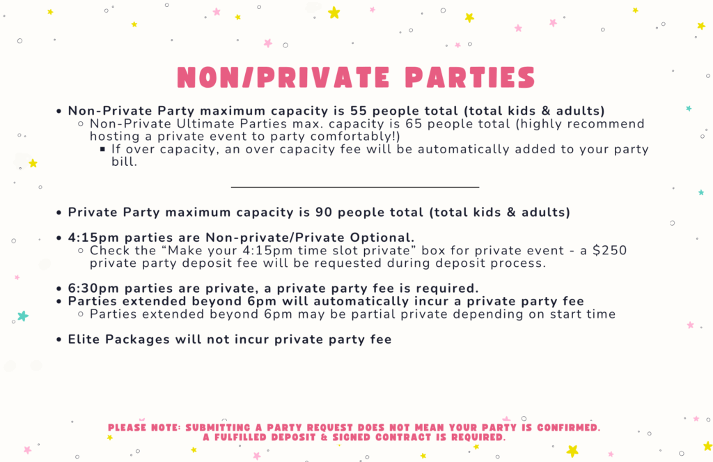 • Parties that end past 6:15pm are automatically private events and will incur a $250 private party fee.